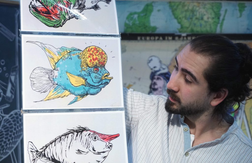 Fische: Isa malt ja schon als Junge viele Fische. Die Bilder sind sein Jugendwerk. Wenn man sich diese Fische ansieht, sind es bereits Karikaturen – die Form, der er sich jetzt widmet.