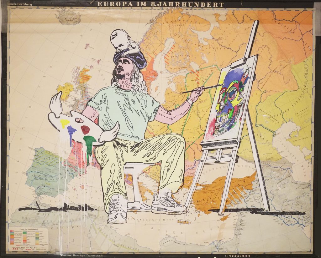 Heimat für Touristen: Das ist erst Mal eine Art Selbstportrait. Aus seiner Lebensgeschichte als Türke, der in Deutschland aufgewachsen ist. Die Frage: Was ist Heimat ? Er kommt dazu, dass er halt ein Reisender ist. Die ganze Welt kann die Heimat sein. Gleichzeitig weiss eh niemand wohin die Reise geht. – Hier ist er mehr von der Streetart und Graffiti beeinflusst.